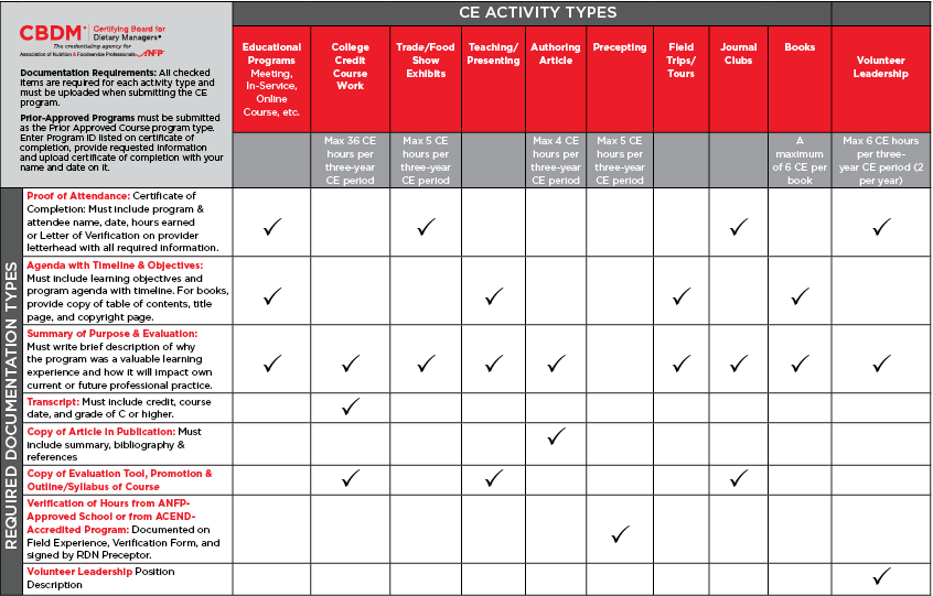All continuing education activities must be related to the CDM, CFPP Scope of Practice which includes the areas of Nutrition, Foodservice, Personnel and Communication, Sanitation and Safety, and Business Operations.